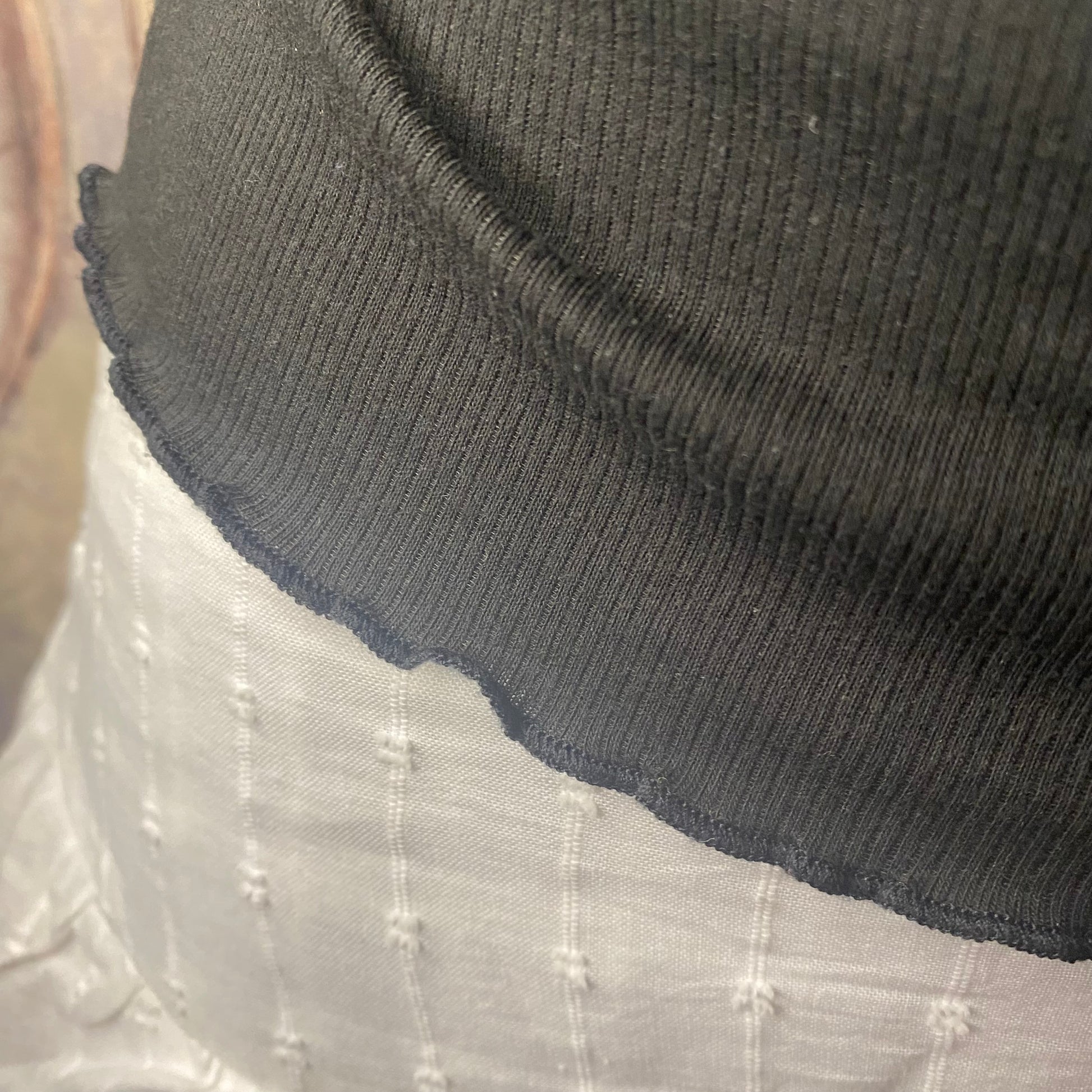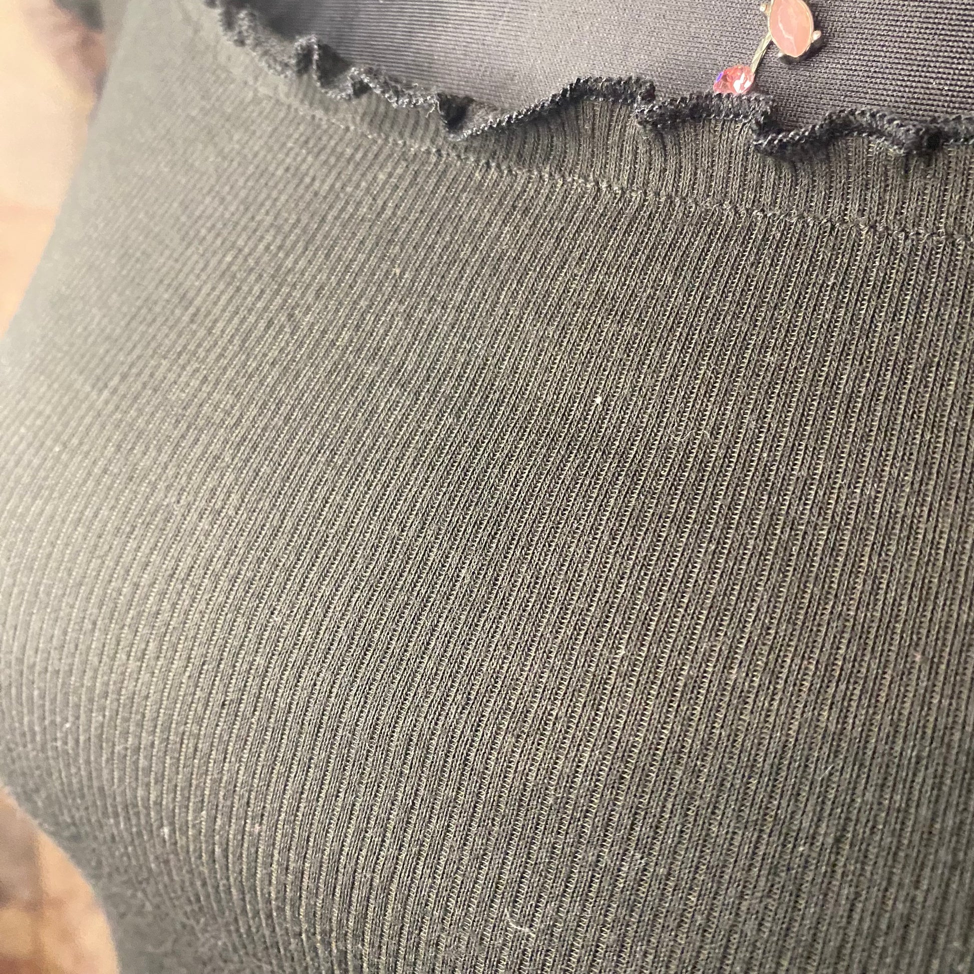 Good quality material. Very stretchy. Can be worn completely off shoulders, slightly off shoulders or on. No visible defects.