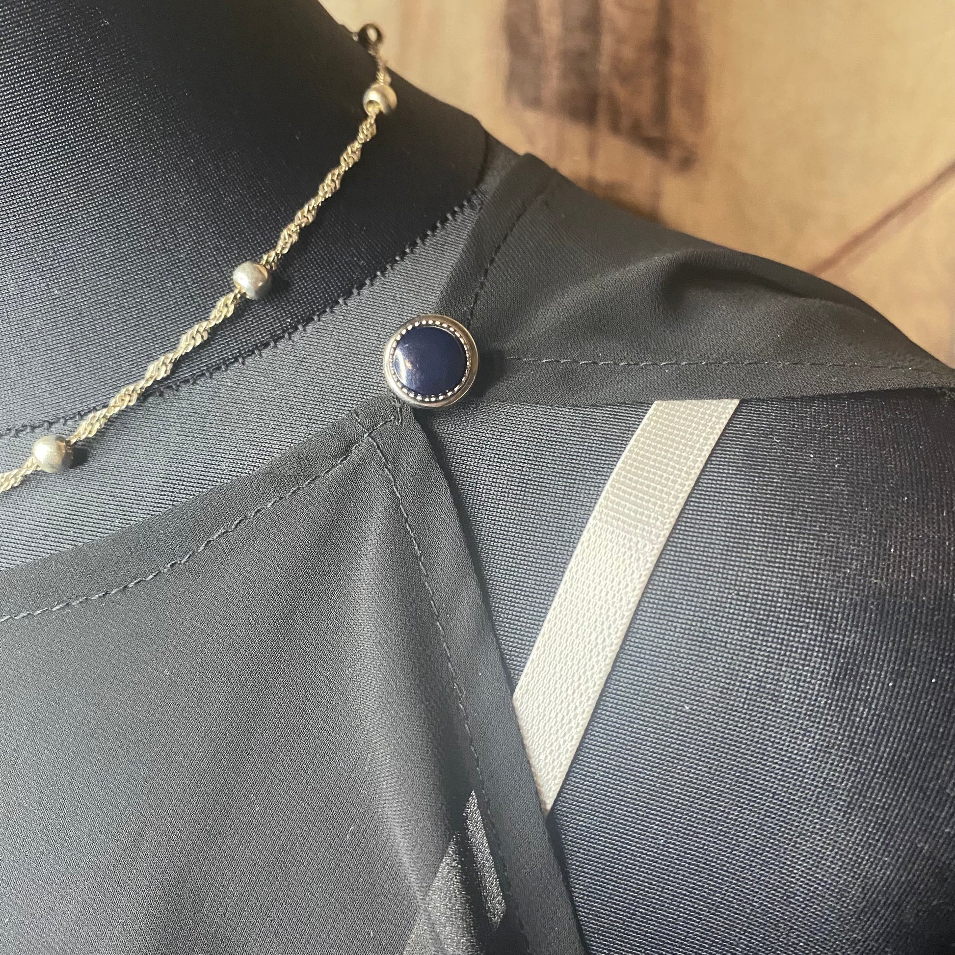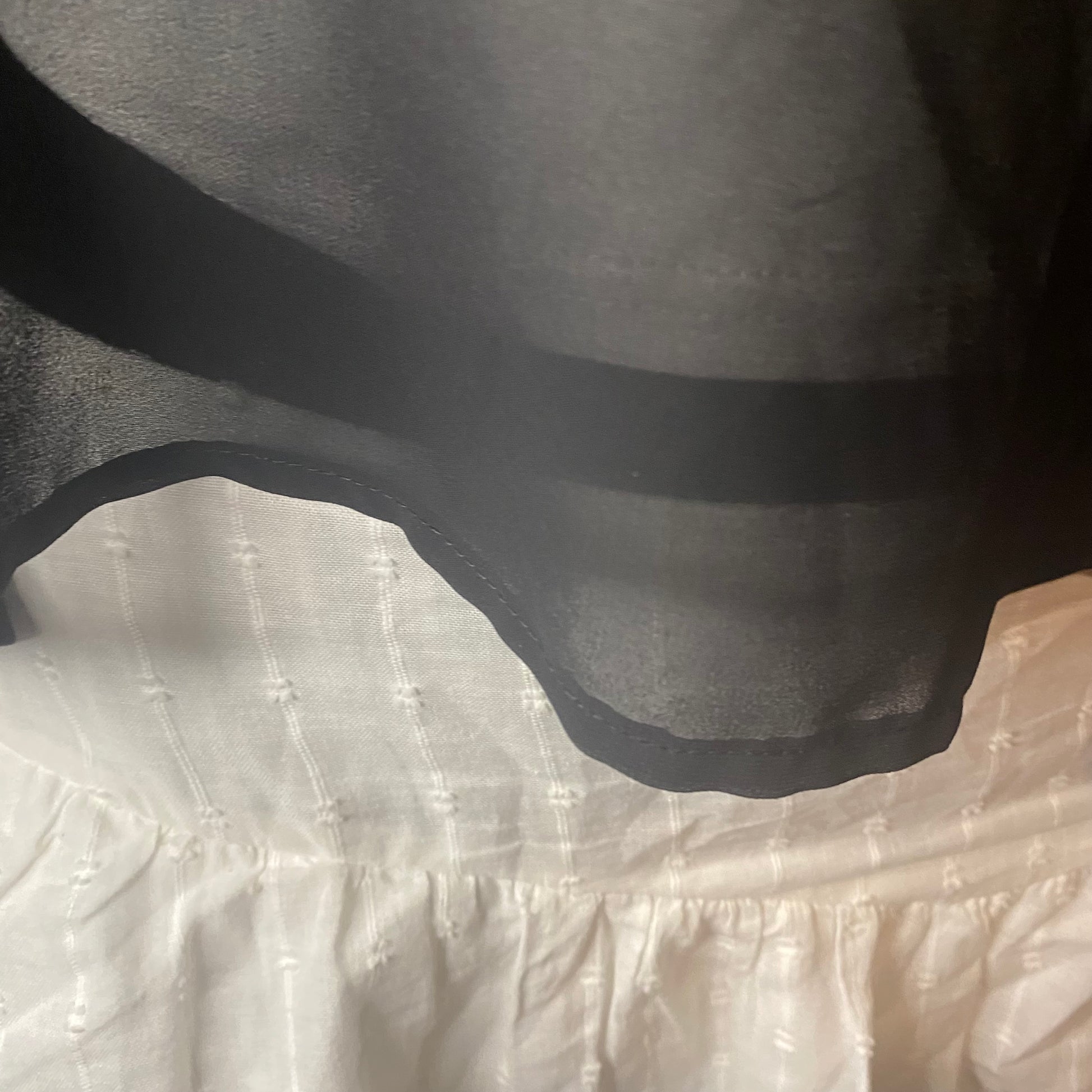 No visible defects. Very flattering, whimsical and formal fit. Not stretchy, very light material. Can be unbuttoned. Will fit almost any size.