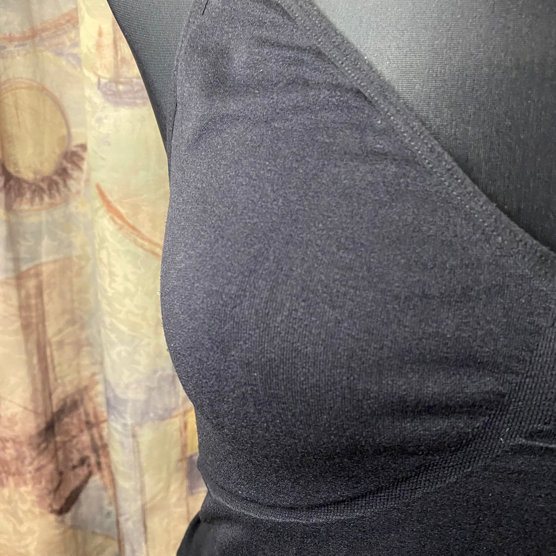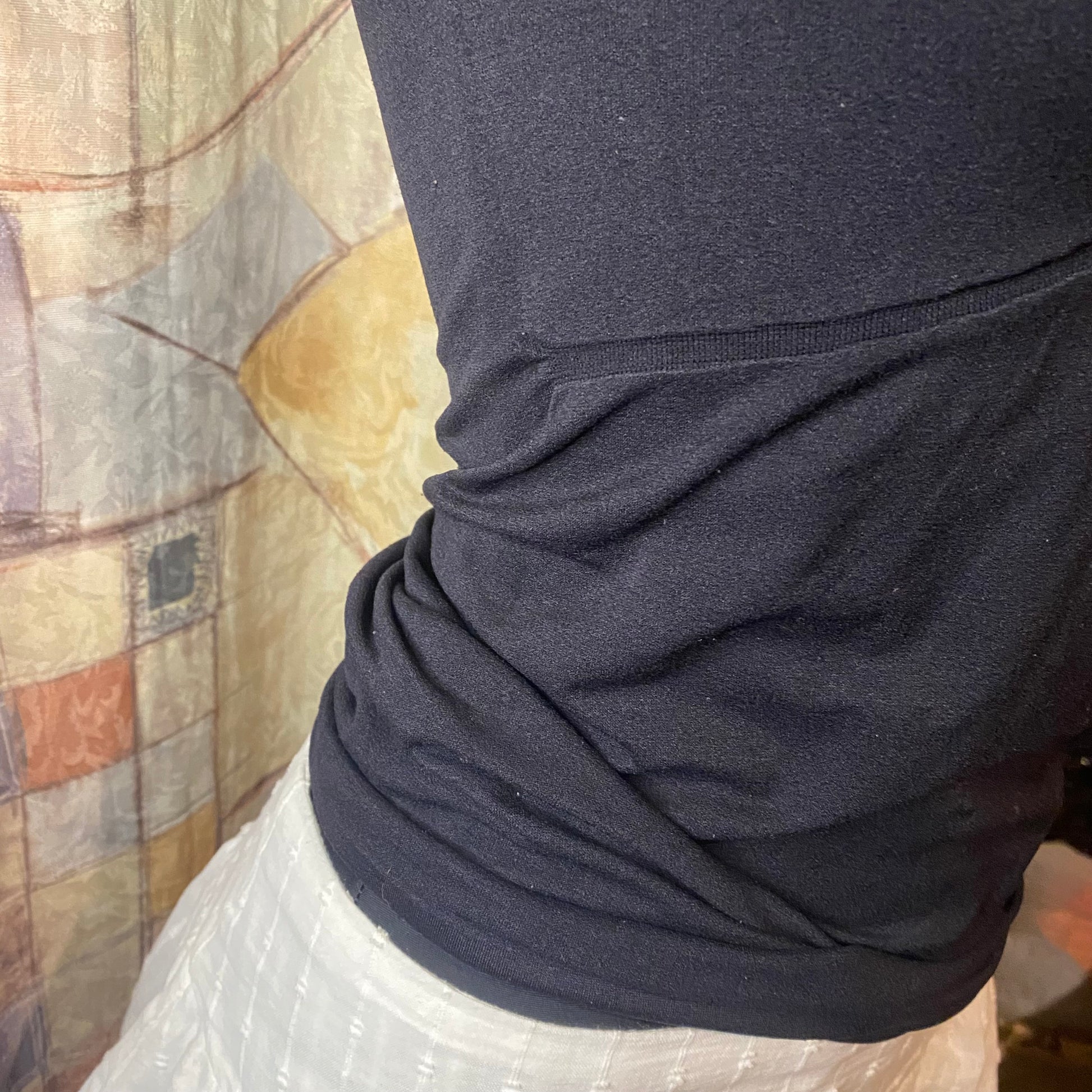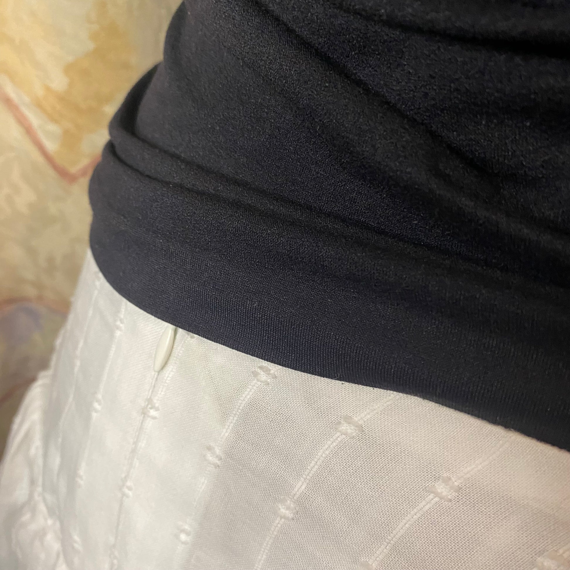 For bigger sizes will fit like shapewear, for smaller — like a regular stretchy top. Good quality material. Extremely stretchy. The top has a small hole where the label should be. The label has been cut off. No other visible defects.