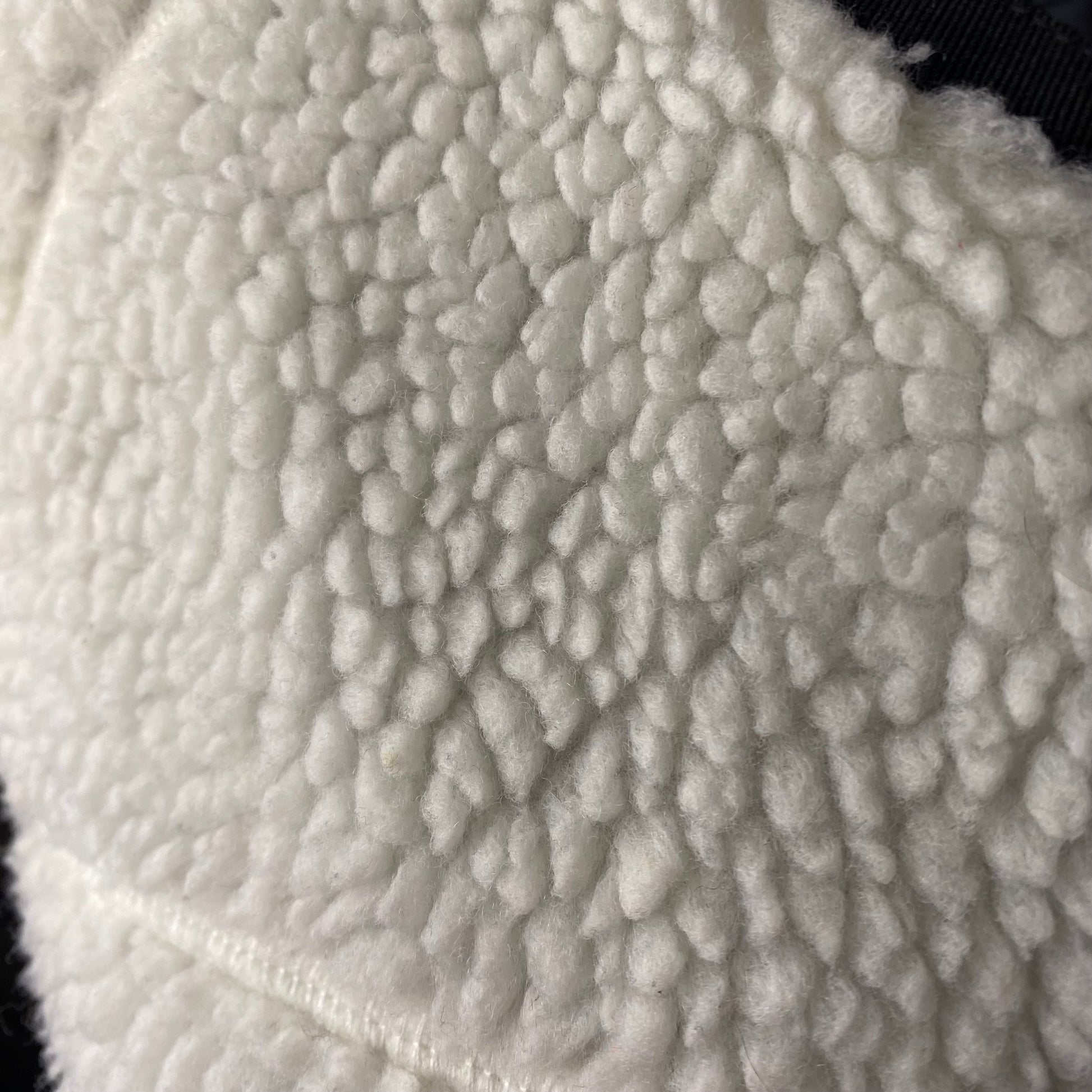 No defects. Extremely good quality material. Very thick and warm. New one costs 170 euros. Has some small stains that are barely or not visible at all while wearing.