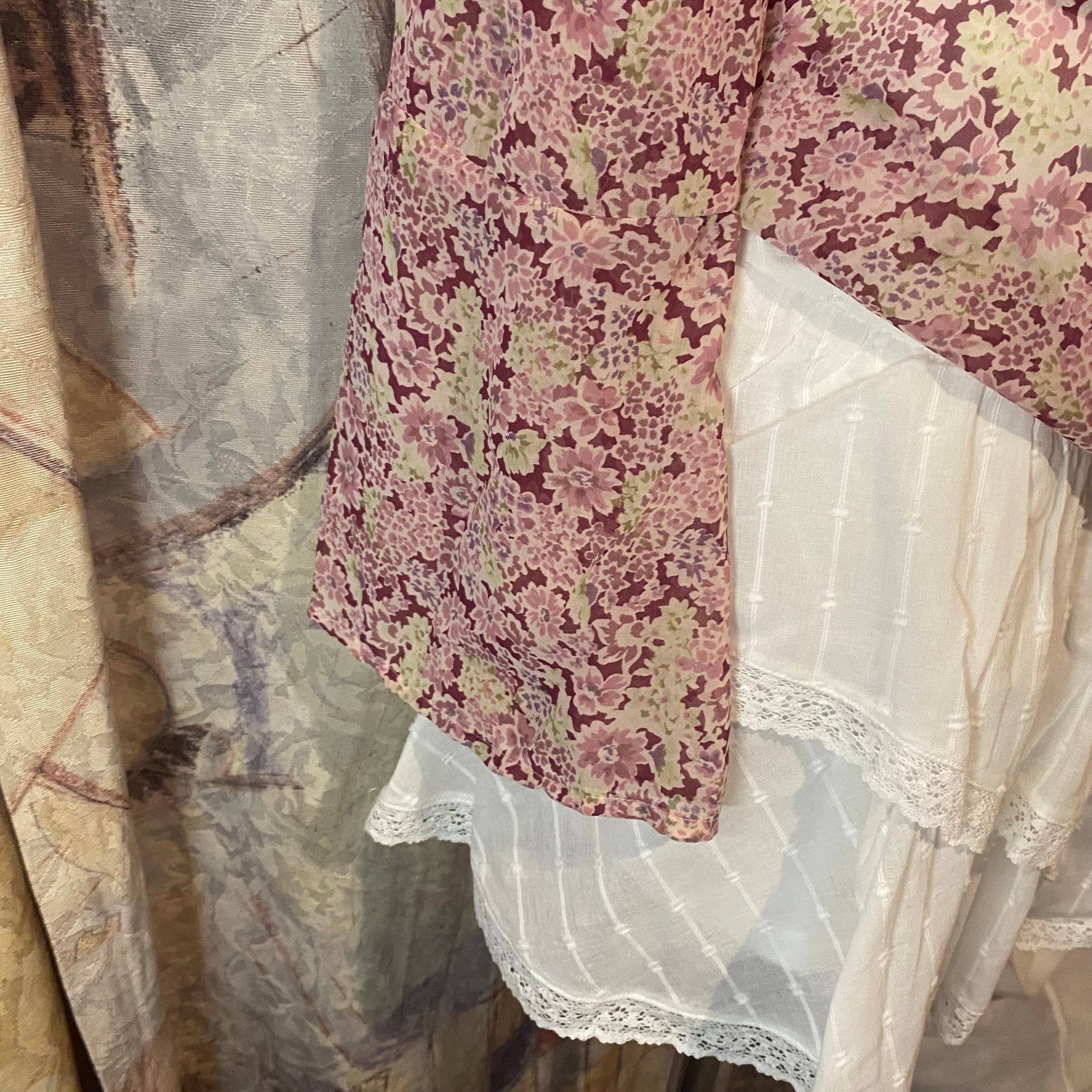 Not stretchy. Can be tied up at the back to fit perfectly around the waist. Not as see-through. Flared sleeves. Super flattering fit. No visible defects. Size M, but could fit an XS too.