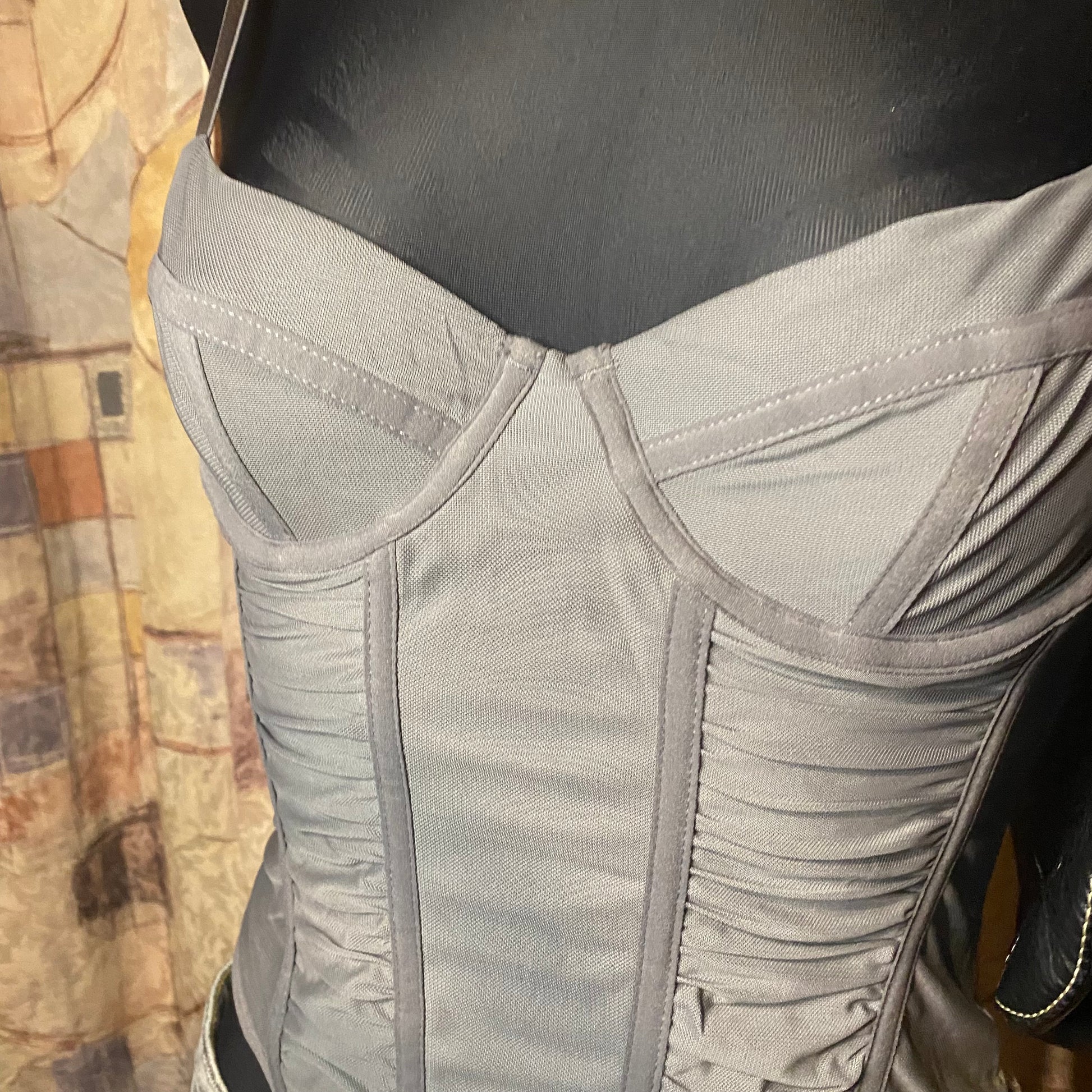 No visible defects. Medium stretch. The straps are adjustable. Has bra type clasps on the back. Okay quality material.