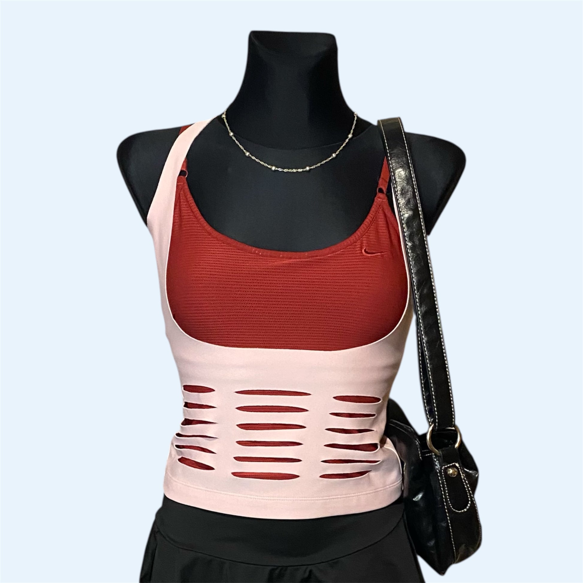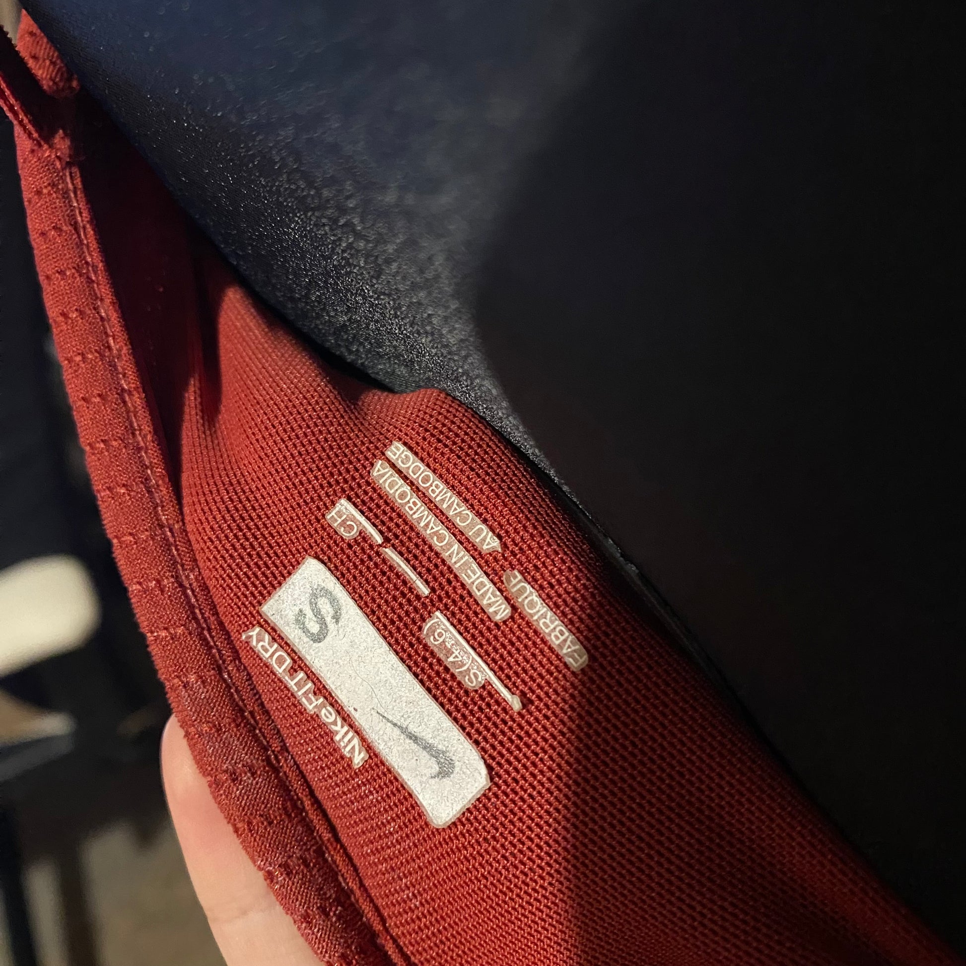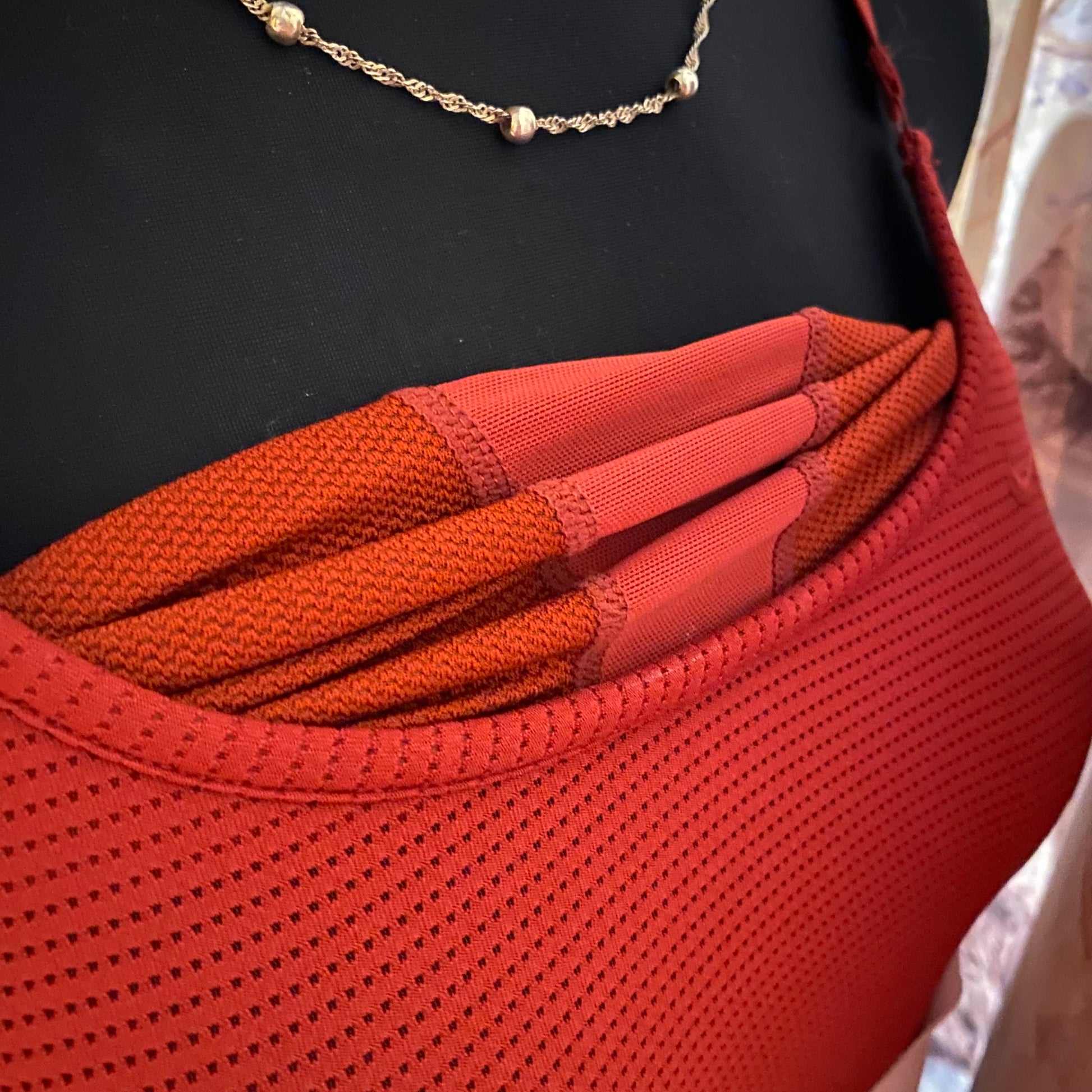 Very stretchy, good quality material. The same cut style is on the back. Double lined in the chest area. No visible defects.