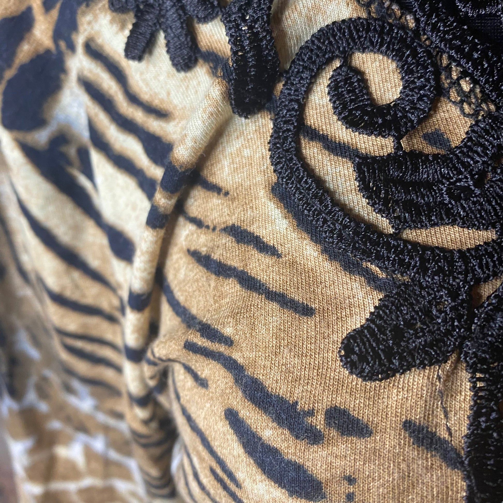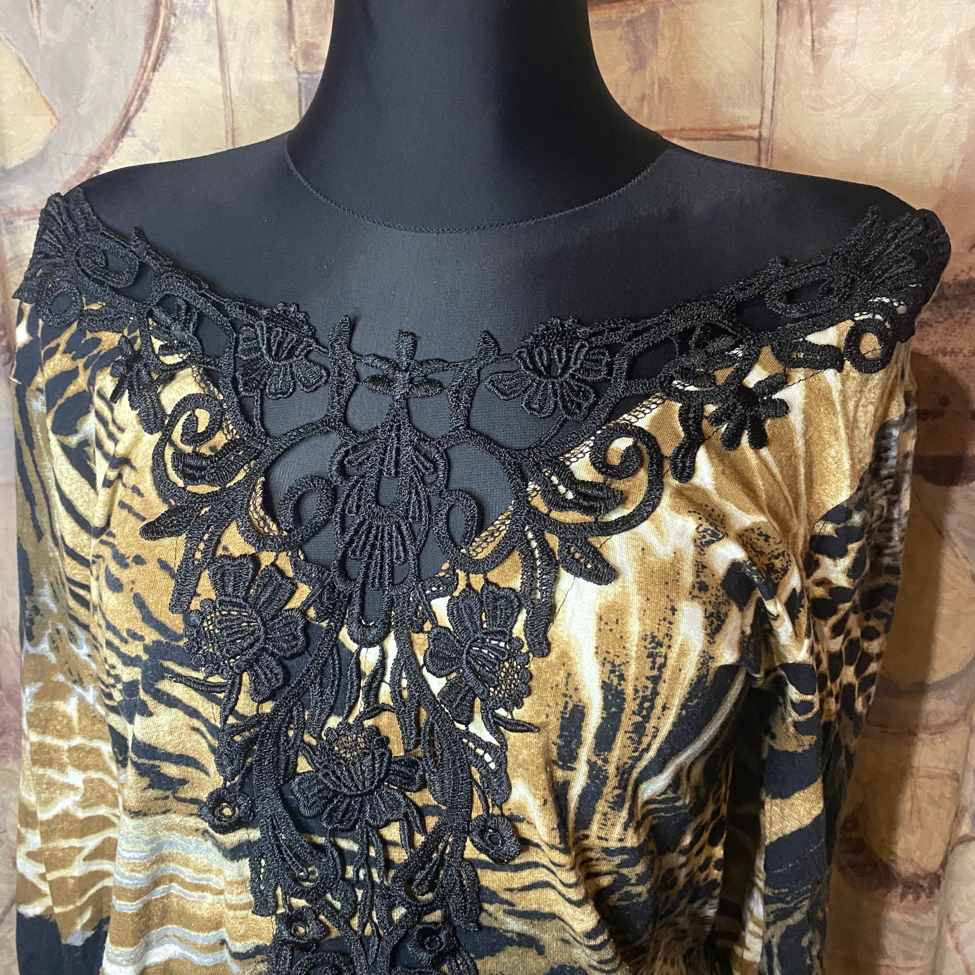 No visible defects. Good quality material. Has some stretch. Flattering design. No size or brand label. Most likely an M. Can be worn on or off shoulders.