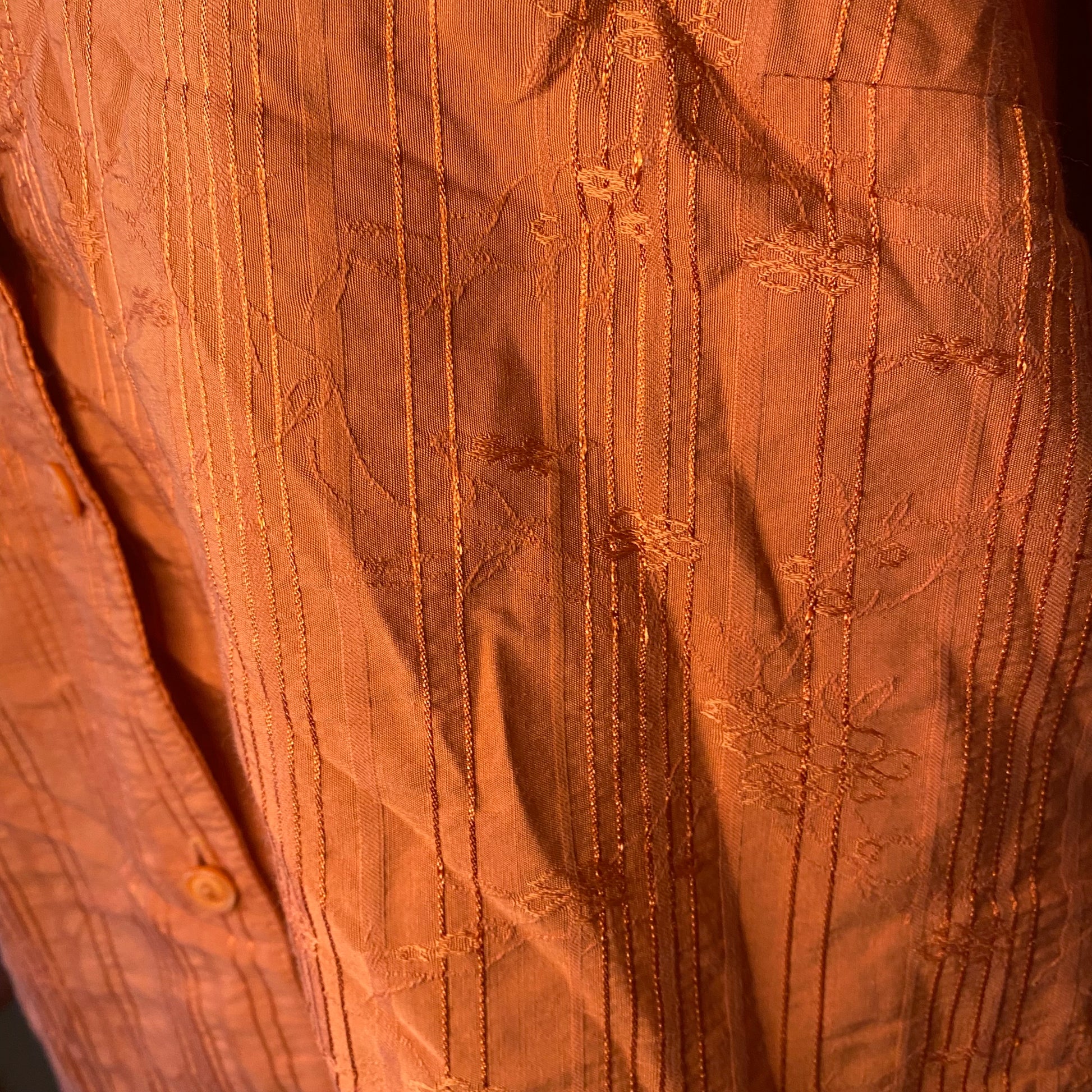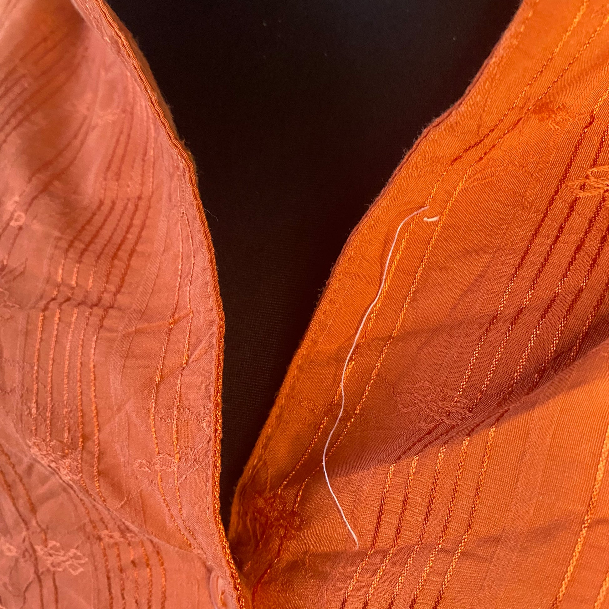 One button is missing, but other than that, no other defects. No stretch. Good quality material, very beautiful pattern. Has shoulder pads. Has weird sizing — on the label is 46EU/XXXL, but fits this size S mannequin just fine. So more like an L.