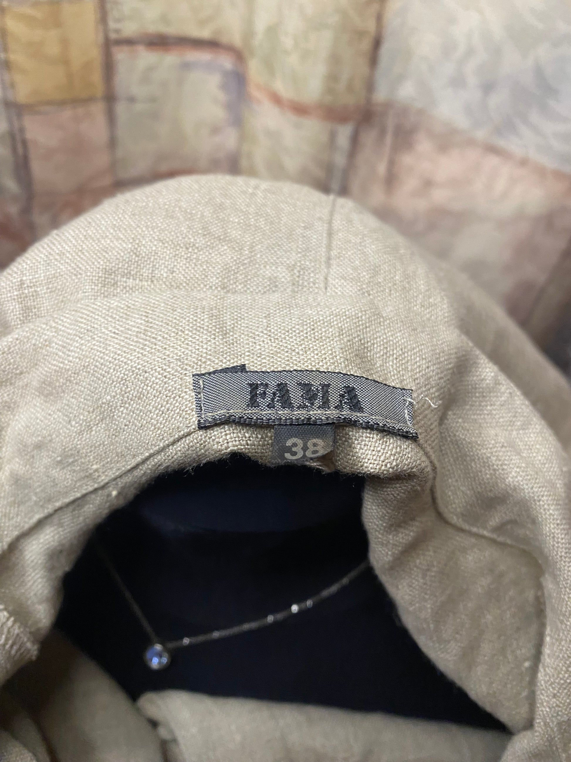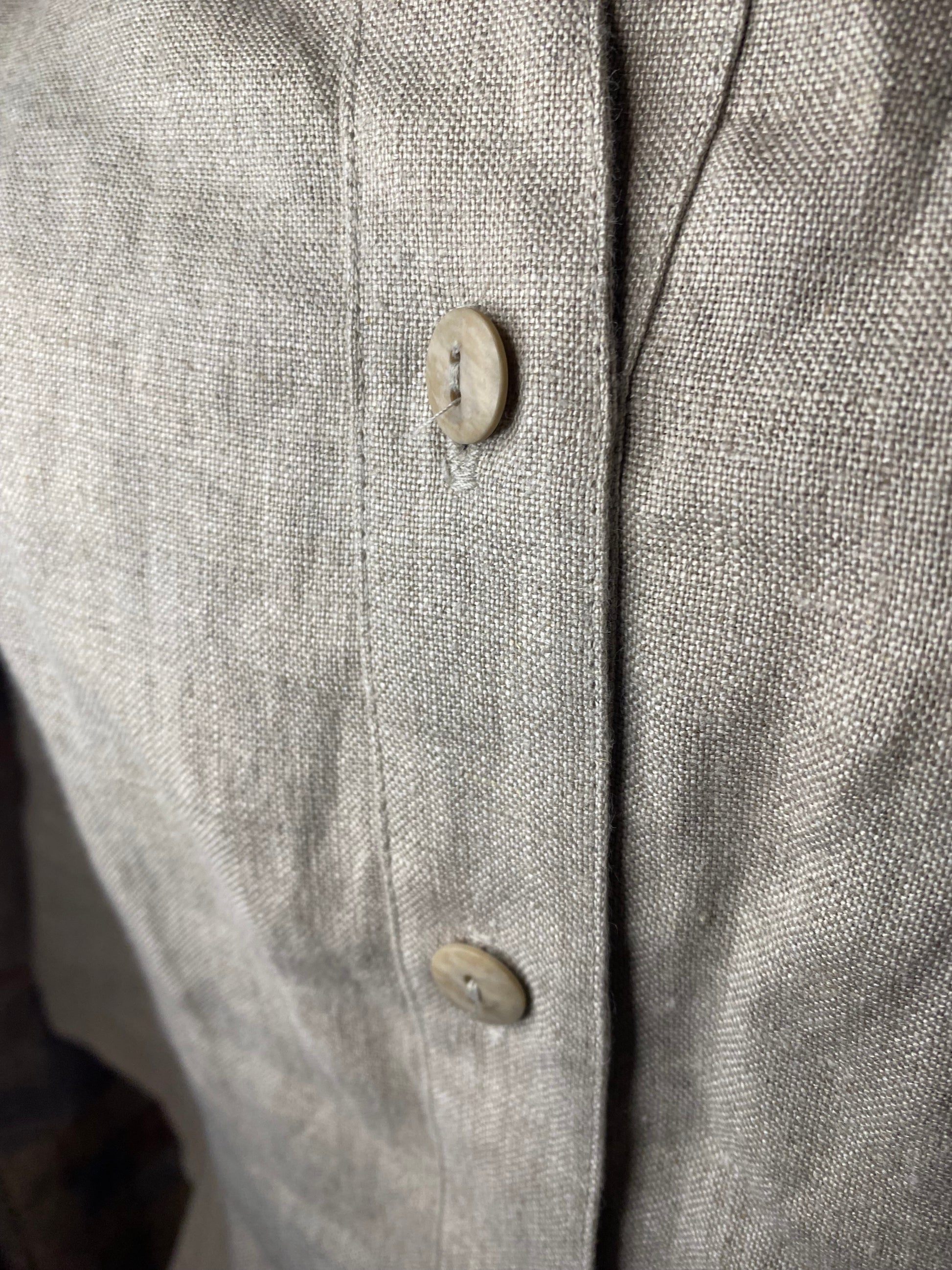 100% linen. Extremely good quality material. No visible defects. Has small stretch. Super flattering fit. Can be perfect for casual as well as more formal outings.