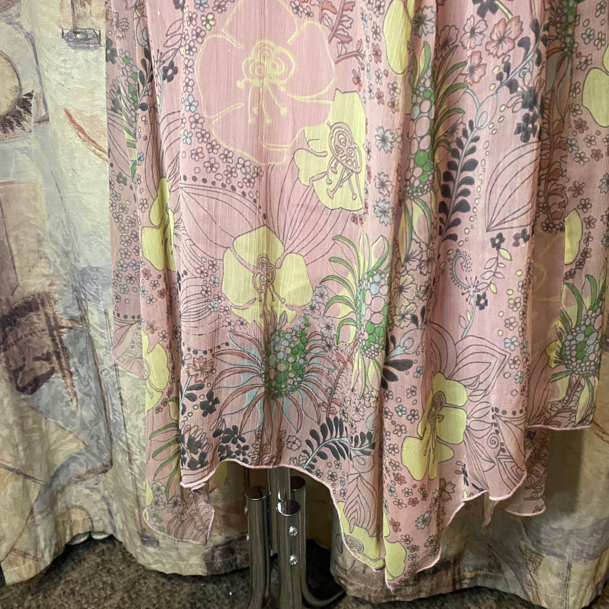Comes with a matching scarf. The material is light and flowy. It’s a midi dress. This dress beautifully sits on your body, feels very comfortable. The dirty pink colour is perfect for any formal occasion.