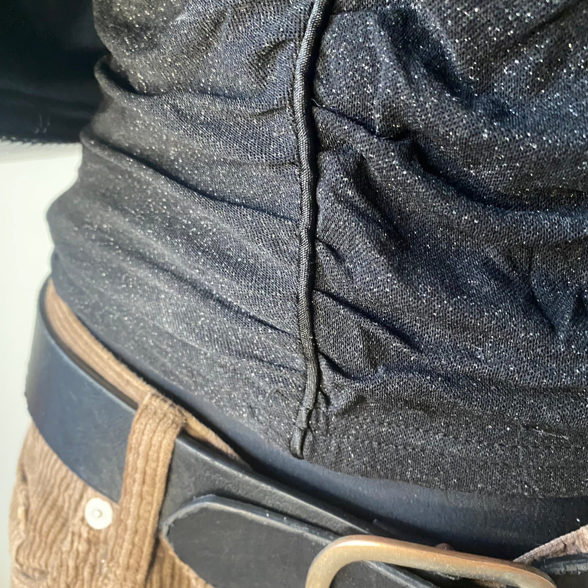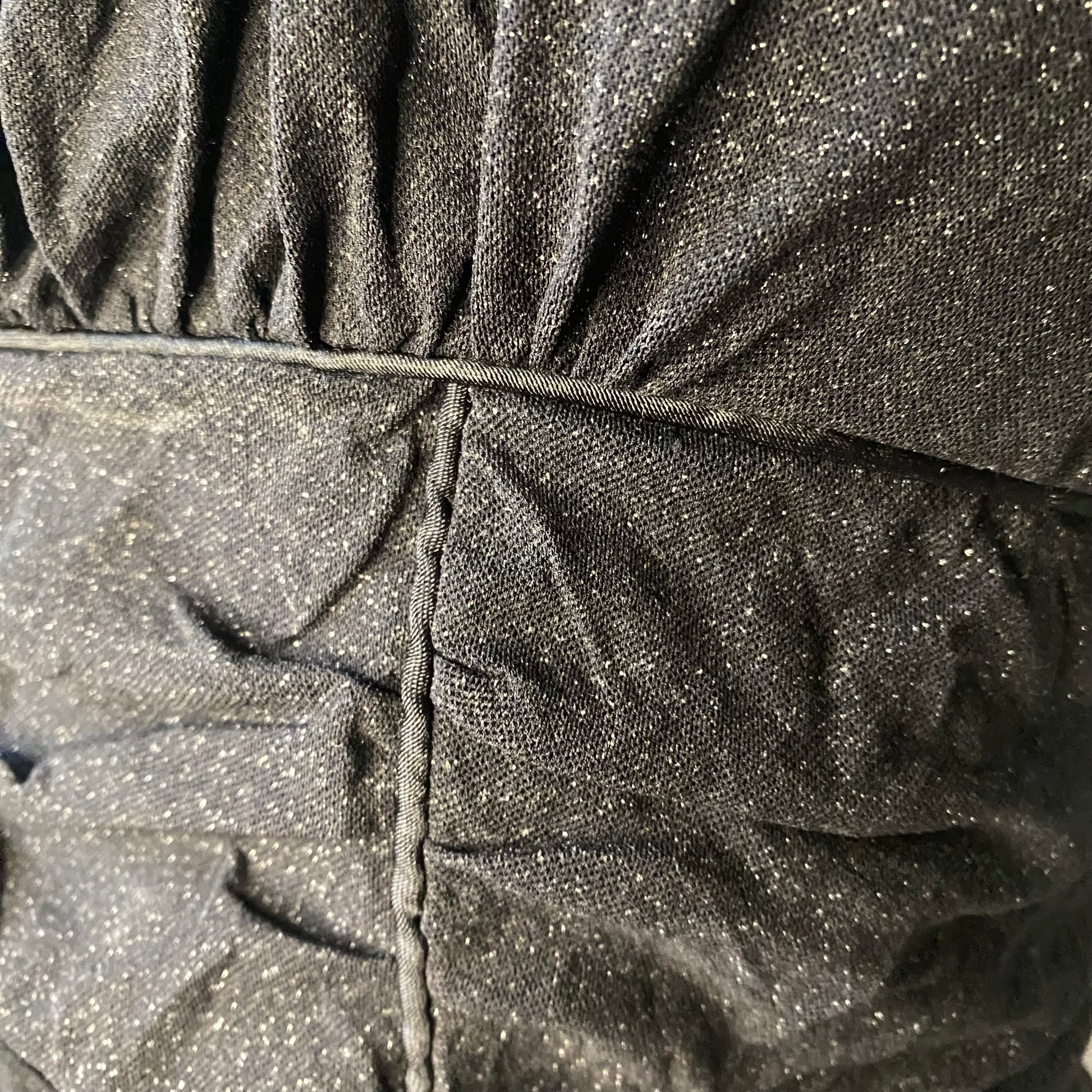Very beautiful rusching. Extremely stretchy. Good quality material. No visible defects. The straps are not adjustable. The sparkles are part of the material, so they won’t fall off.