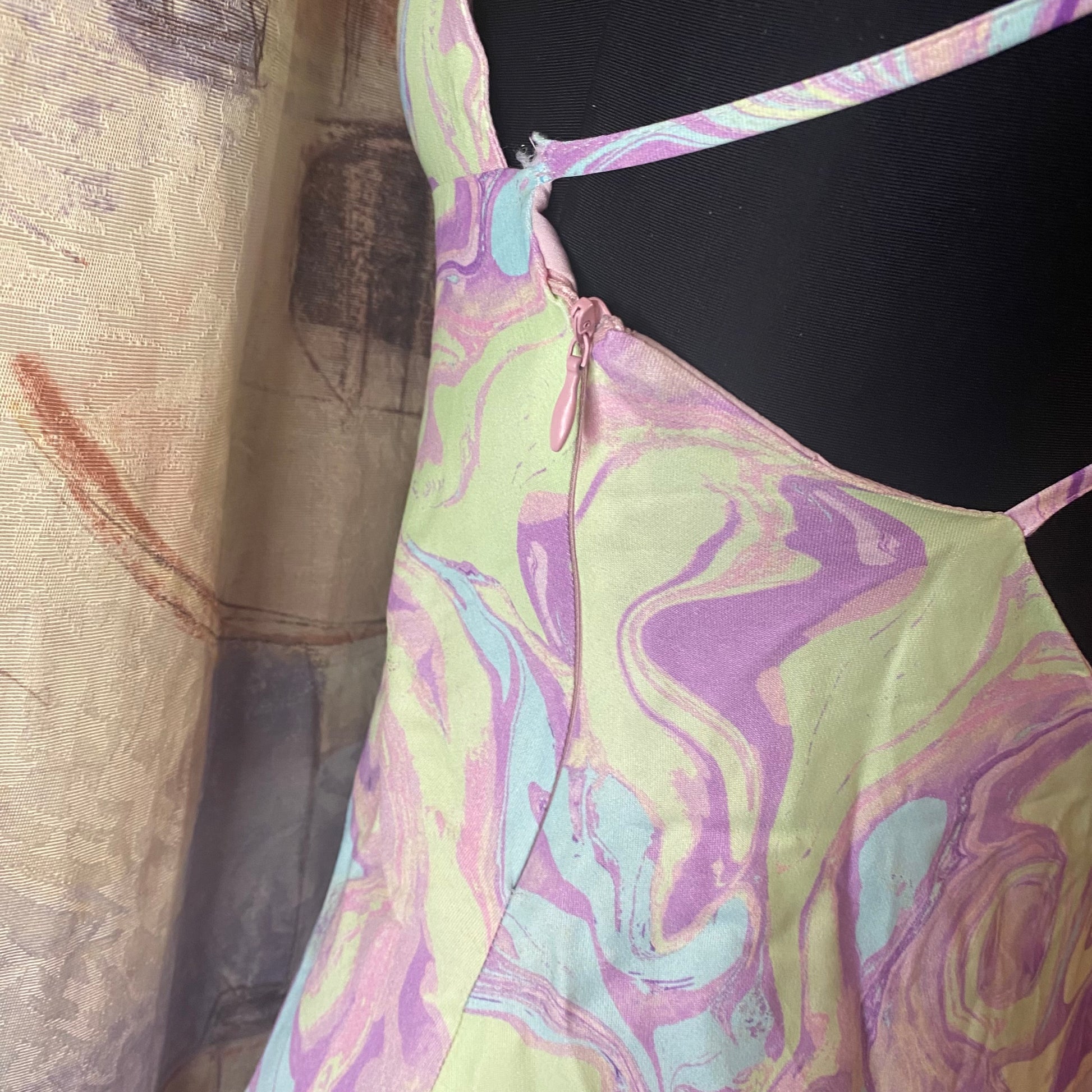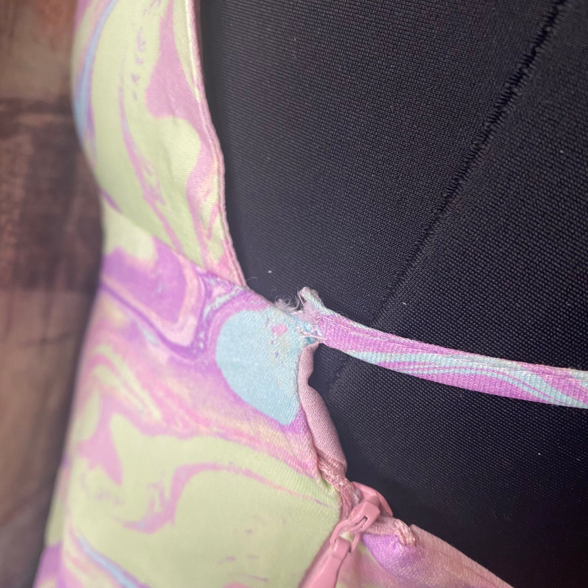 Super cute fit. Very good quality material, not stretchy. No visible defects except for one strap breaking off.